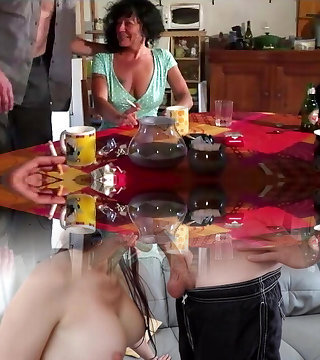 Friend's mature mommy and young guys gangbang in kitchen